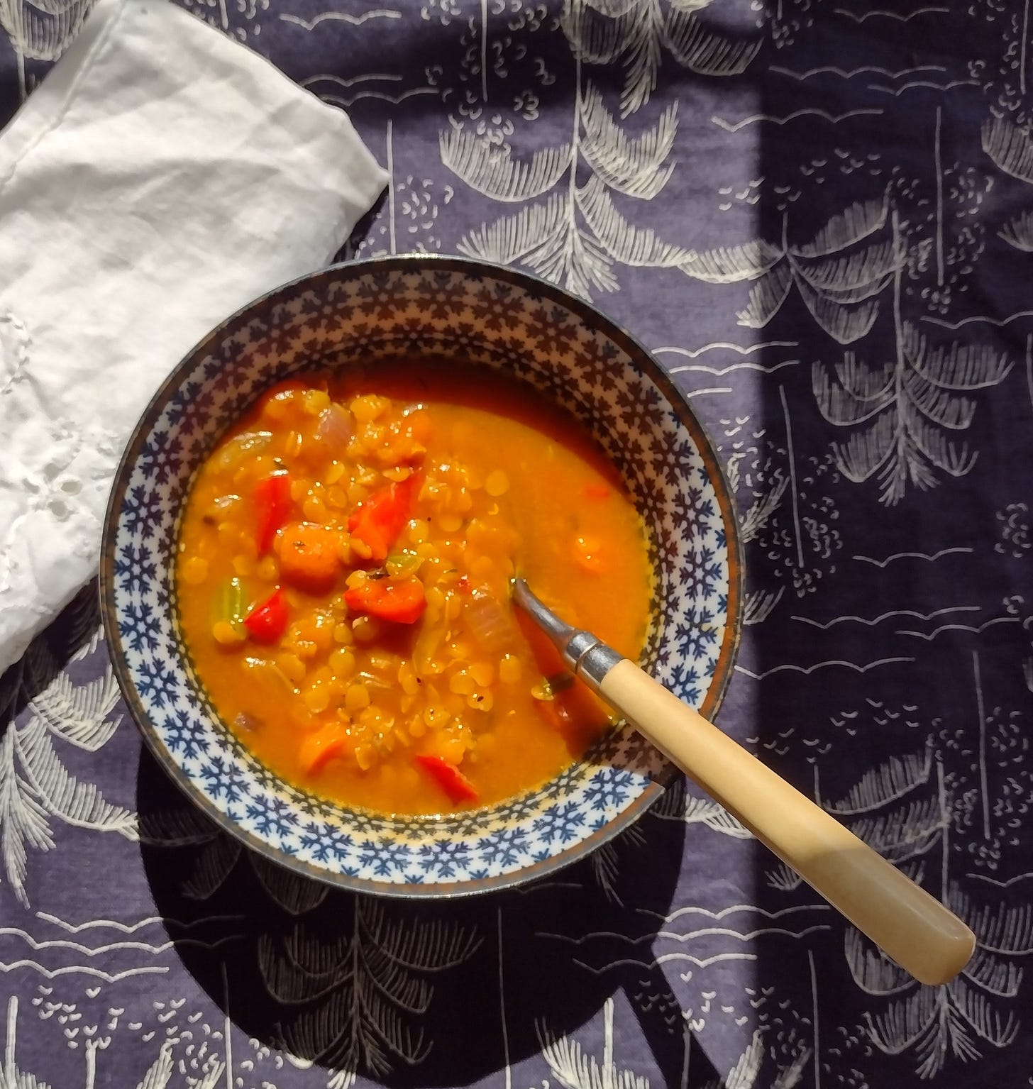 Heat oil in a soup pot. Sautee onions, carrots, celery, and red pepper on medium-low for 10 minutes or until they are soft. Add garlic and lentils and cook for an additional 2 minutes. Add salt, pepper, stock, pumpkin, and herbs. Let simmer for about 25 minutes. Taste. Add salt, pepper, or additional herbs as needed. Make sure that the lentils are soft.