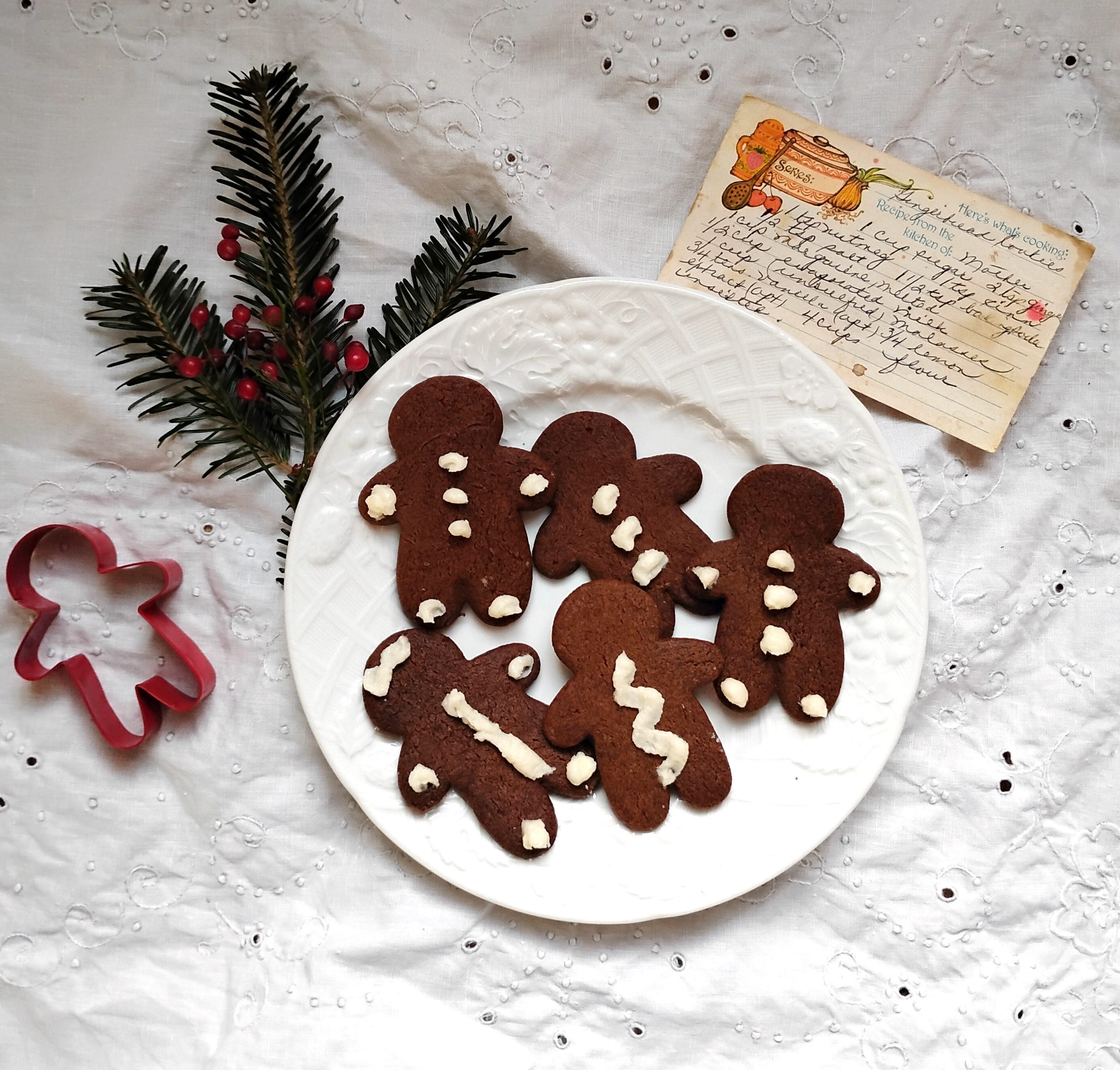 The exotic amaryllis, too tall to use as a centerpiece, and so fast-growing that it may bloom while you step out to check the mailbox, keeps me company on a bench in the kitchen. Its top-heavy, fiery red-orange blooms are in sharp contrast to the snow and sleet that have closed down all the local schools for the day. It’s a perfect morning for baking, and I have gingerbread men on my mind. I find the list of ingredients for gingerbread cookies on a recipe card in my mom’s handwriting, minus any directions, but I have baked enough cookies that I don’t see this as a problem. The first “men” out of the oven have spread a bit, but they have kept their shape by the second batch. In contrast to the amaryllis, they are homespun and sturdy.